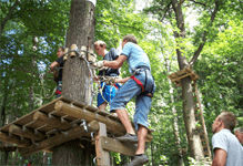 Im Kletterwald warten Spaß, Abenteuer und Action auf Sie. An insgesamt 85 Kletterelementen können Sie 7 verschiedene Parcours bezwingen. Dabei steigt der Schwierigkeitsgrad ständig an. Über Netzbrücken geht es von Baum zu Baum, durch schwankende Bohlen blicken Sie in die Tiefe und manchmal kommen Sie nur vorwärts, wenn Sie sich von Seil zu Seil schwingen. Dabei steht natürlich immer Ihr eigenes Vergnügen im Mittelpunkt. Wer es wagt, kann 120 Meter weit an Seilbahnen durch den Wald rasen. Besonders mutige überwinden 13 Meter nach unten wie im Flug – durch einen Sprung ins Netz. Der Kletterwald warnt: „Vorsicht! Spaßgefahr!“